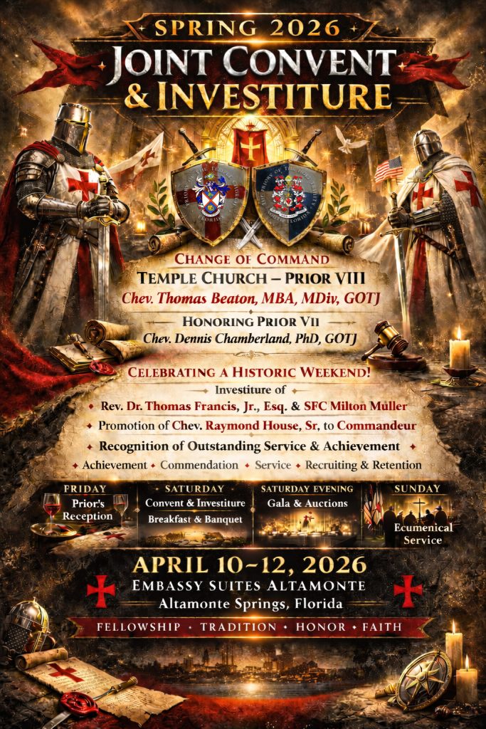 Grand Treasurer Chev. David Botsko, PhD, GCTJ, CMTJ, will officiate this historic and solemn Convent & Investiture at the Embassy Suites Altamonte on April 10–12, 2026.